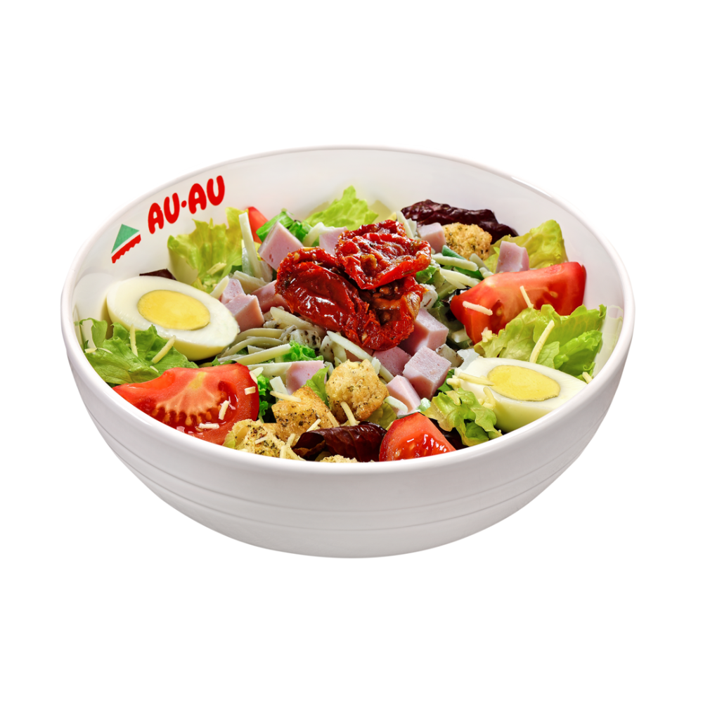 Alface americana, alface roxa, rúcula, tomate, tomate seco, queijo parmesão, queijo branco, peru defumado, ovo cozido, croutons e molho de sua preferência.