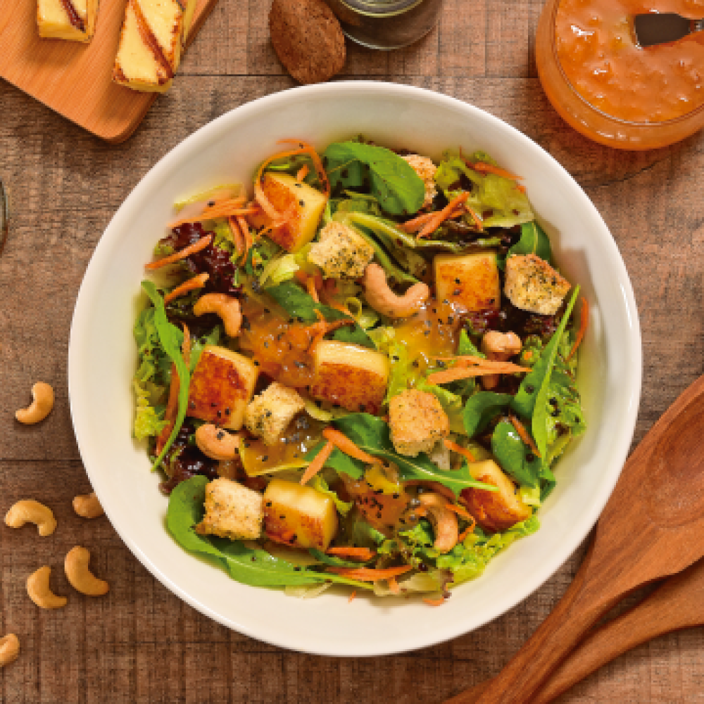 Alfaces americana e roxa, rúcula, queijo coalho, geleia de damasco, cenoura, gergelim negro, croutons, castanha de caju e molho balsâmico com mel.